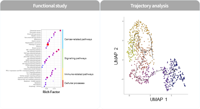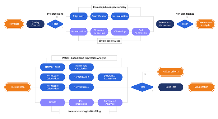 타겟 발굴 인하우스 데이터, 빅데이터, 단일세포 RNA 시퀀싱을 포함한 다양한 분석 기법을 통해 면역항암치료 불응성에 기여하는 잠재 요인들(SMRTs)을 스크리닝 및 식별